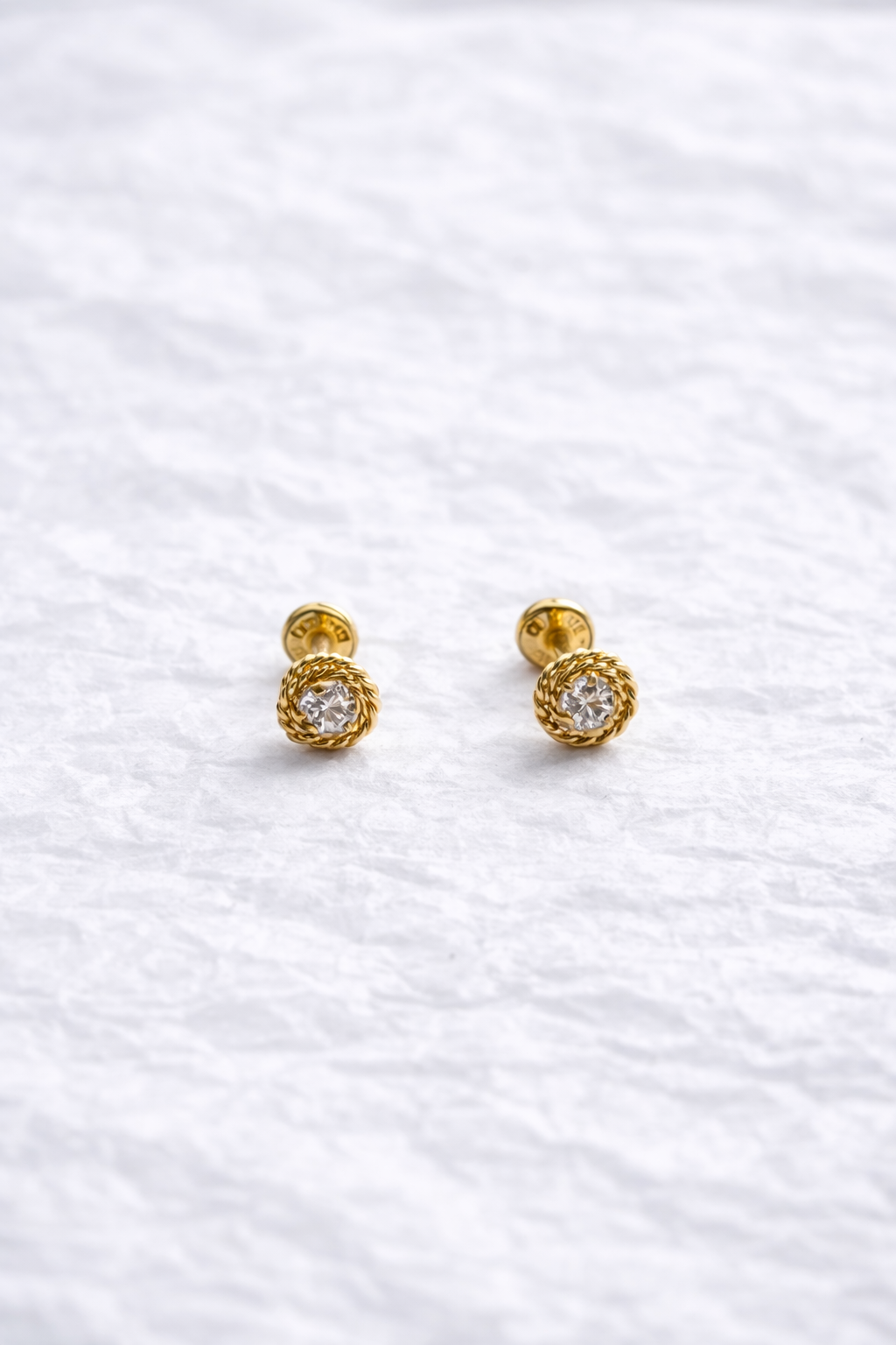 Estos topos destacan por su delicado borde en oro que enmarca un centro blanco brillante, creando un contraste elegante y luminoso que realza cualquier look.