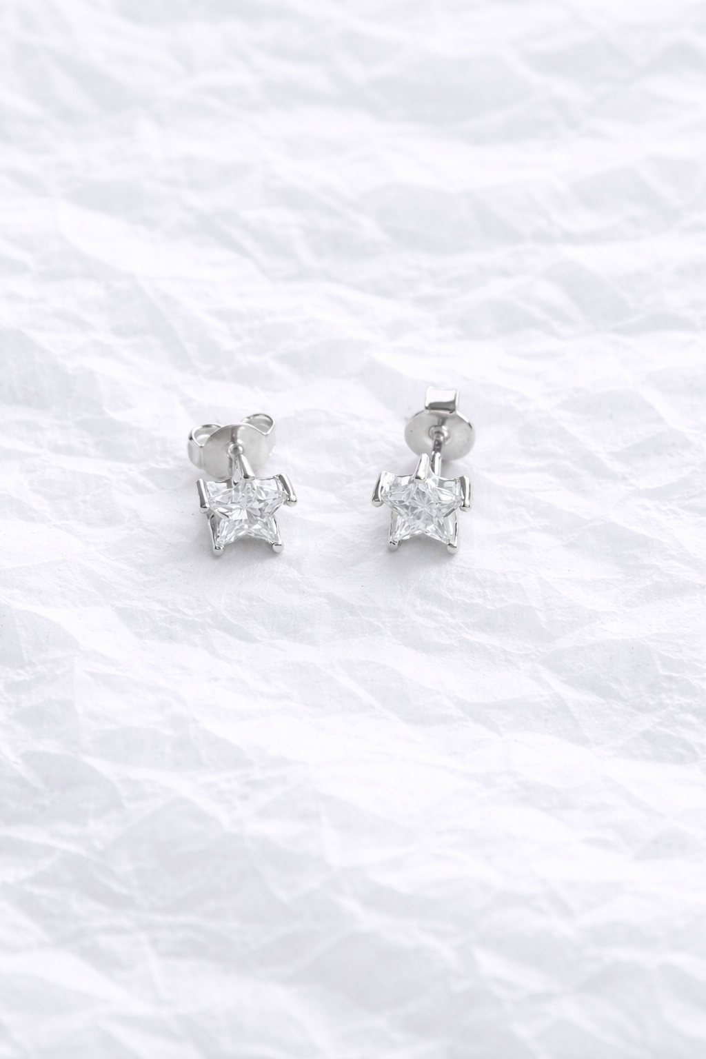 Par de topos en forma de estrella elaborados en plata, con zirconia transparente que refleja la luz de manera elegante y discreta. Presentados sobre un fondo de papel de seda blanco, que aporta suavidad y luminosidad a la imagen, resaltando el brillo natural de la pieza. Su diseño minimalista los convierte en el complemento perfecto para el uso diario o para añadir un toque delicado y femenino a cualquier look. Una joya atemporal, ligera y fácil de combinar.